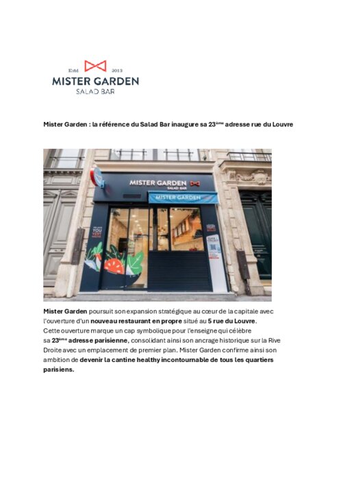 Mister Garden poursuit son expansion stratégique au cœur de la capitale avec l'ouverture d'un nouveau restaurant en propre situé au 5 rue du Louvre. Cette ouverture marque un cap symbolique pour l'enseigne qui célèbre sa 23e adresse parisienne, consolidant ainsi son ancrage historique sur la Rive Droite avec un emplacement de premier plan. Mister Garden confirme ainsi son ambition de devenir la cantine healthy incontournable de tous les quartiers parisiens.