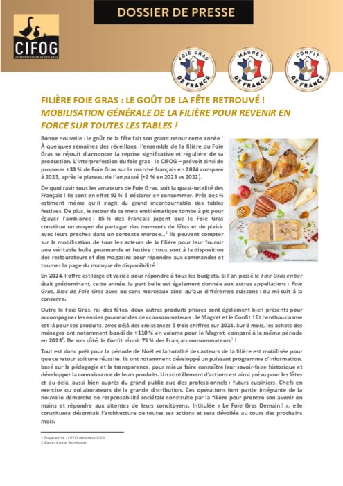 À quelques semaines des réveillons, l’ensemble de la filière du Foie Gras se réjouit d’annoncer la reprise significative et régulière de sa production. L’Interprofession du foie gras - le CIFOG – prévoit ainsi de proposer +33 % de Foie Gras sur le marché français en 2024 comparé à 2023, après le plateau de l’an passé (+2 % en 2023 vs 2022).