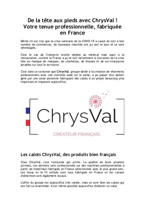 Fournisseurs 18 novembre 2022 - 08:15 ChrysVal, groupe dédié à la création de vêtements professionnels avec une clientèle axée sur la santé, a pu passer d'un atelier géré par une seule personne fabriquant des calots à un projet beaucoup plus important et imposant aujourd'hui. PDF (274 Ko) Télécharger