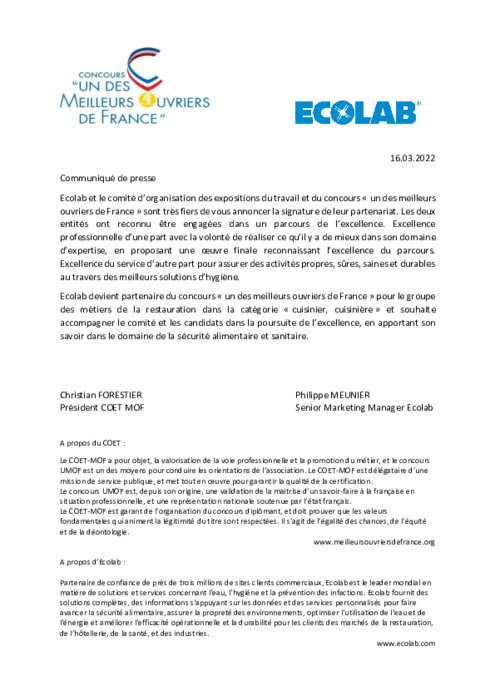 Métiers 18 mars 2022 - 13:29 Le concours « Un des Meilleurs Ouvriers de France », plus connu sous le nom de MOF, et Ecolab ont signé cette semaine un partenariat visant à promouvoir l’excellence à laquelle les deux organisations sont attachées. PDF (96 Ko) Télécharger