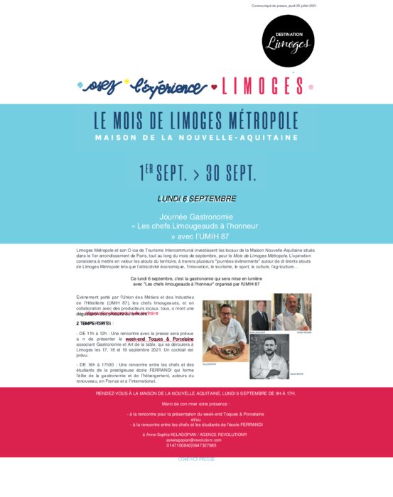 Métiers 29 juillet 2021 - 10:14 Limoges Métropole et son Office de Tourisme Intercommunal investissent les locaux de la Maison Nouvelle-Aquitaine situés dans le 1er arrondissement de Paris, tout au long du mois de septembre, pour le Mois de Limoges Métropole. PDF (388 Ko) Télécharger
