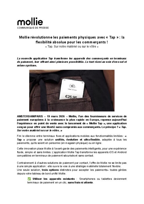 Mollie, l’un des fournisseurs de services de paiement européens à la croissance la plus rapide en Europe, repense aujourd’hui l’expérience en point de vente avec le lancement de « Mollie Tap », une application conçue pour offrir une liberté sans compromis aux commerçants. Le principe ? « Tap. Sur notre matériel ou sur le vôtre. »