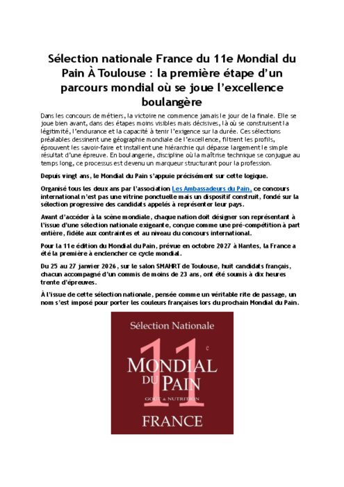 À Toulouse, la France a ouvert le cycle du 11e Mondial du Pain, qui se tiendra en octobre 2027 à Nantes. Huit binômes, dix heures trente d’épreuves, un format calqué sur l’exigence mondiale : bien plus qu’un concours, une mise à l’épreuve grandeur nature de l’endurance, de la transmission et de la capacité à représenter une profession.