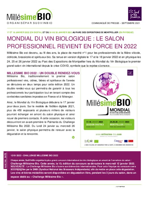 Métiers 02 décembre 2021 - 15:43 Millésime Bio est devenu, au fil des ans, la place de marché n°1 pour les professionnels de la filière viticole, cidricole, brassicole et spiritueux bio. PDF (418 Ko) Télécharger