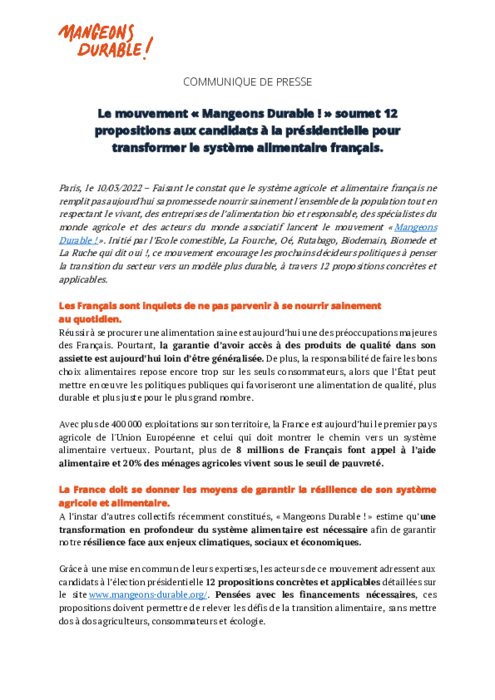 Initié par l’Ecole comestible, La Fourche, Oé, Rutabago, Biodemain, Biomede et La Ruche qui dit oui !, ce mouvement encourage les prochains décideurs politiques à penser la transition du secteur vers un modèle plus durable, à travers 12 propositions concrètes et applicables.