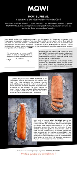 Fournisseurs 09 janvier 2023 - 15:40 MOWI met à l’honneur sa gamme MOWI SUPREME. Une gamme premium, qui propose le meilleur du saumon norvégien au service des Chefs, pour des plats d’exception. PDF (407 Ko) Télécharger