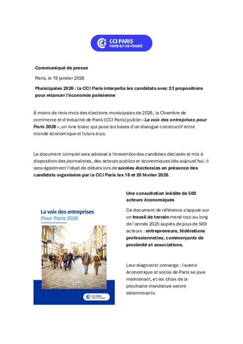 À moins de trois mois des élections municipales de 2026, la Chambre de commerce et d'industrie de Paris (CCI Paris) publie « La voix des entreprises pour Paris 2026 », un livre blanc qui pose les bases d'un dialogue constructif entre monde économique et futurs élus.