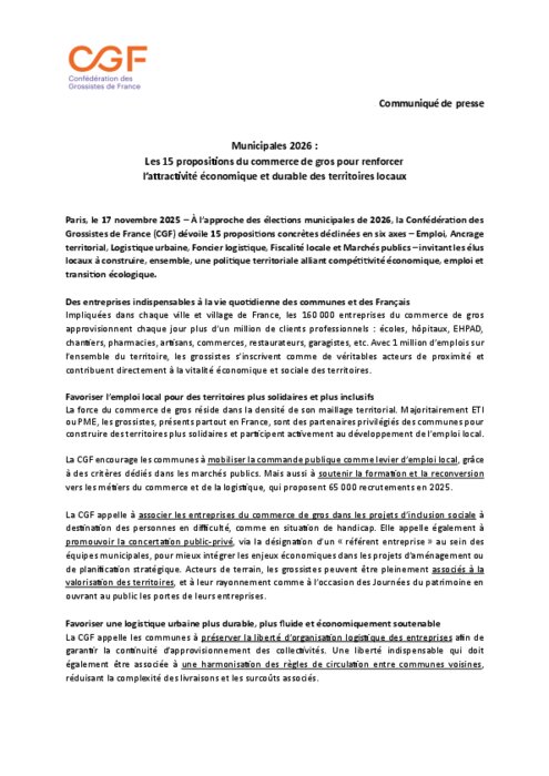 À l’approche des élections municipales de 2026, la Confédération des Grossistes de France (CGF) dévoile 15 propositions concrètes déclinées en six axes – Emploi, Ancrage territorial, Logistique urbaine, Foncier logistique, Fiscalité locale et Marchés publics – invitant les élus locaux à construire, ensemble, une politique territoriale alliant compétitivité économique, emploi et transition écologique.
