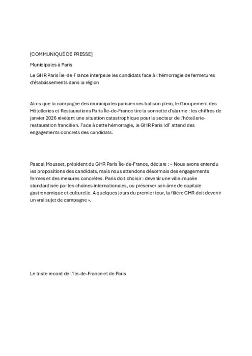 Alors que la campagne des municipales parisiennes bat son plein, le Groupement des Hôtelleries et Restaurations Paris Ile-de-France tire la sonnette d'alarme : les chiffres de janvier 2026 révèlent une situation catastrophique pour le secteur de l'hôtellerie-restauration francilien. Face à cette hémorragie, le GHR Paris IdF attend des engagements concrets des candidats.