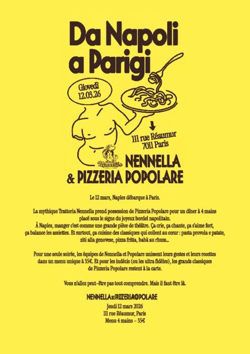 Le jeudi 12 mars, Trattoria Nennella débarque chez Pizzeria Popolare pour un dîner à 4 mains (et clairement pas discret). Au programme : pasta provola e patate, ziti alla genovese, pizza fritta, babà… un concentré de Naples dans un menu unique à 35€.