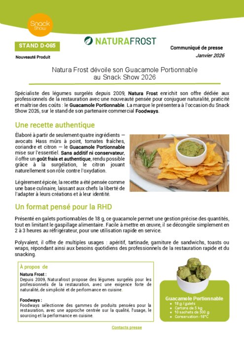 Spécialiste des légumes surgelés depuis 2009, Natura Frost enrichit son offre dédiée aux professionnels de la restauration avec une nouveauté pensée pour conjuguer naturalité, praticité et maîtrise des coûts : le Guacamole Portionnable. La marque le présentera à l’occasion du Snack Show 2026, sur le stand de son partenaire commercial Foodways.
