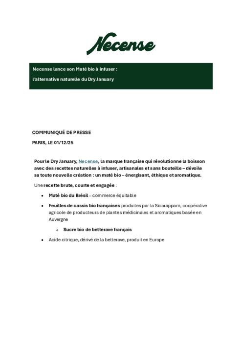 Pour le Dry January, Necense, la marque française qui révolutionne la boisson avec des recettes naturelles à infuser, artisanales et sans bouteille – dévoile sa toute nouvelle création : un maté bio – énergisant, éthique et aromatique.