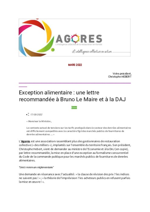 Métiers 22 mars 2022 - 13:01 L'Agores est une association rassemblant plus des gestionnaires de restauration collective (« des milliers »), implantés sur l'ensemble du territoire français. PDF (125 Ko) Télécharger