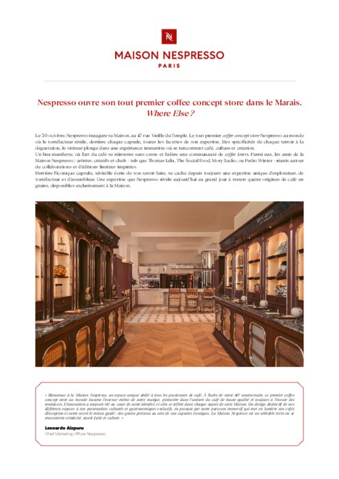 Le 30 octobre, Nespresso a inauguré sa Maison, au 47 rue Vieille du Temple. Le tout premier coffee concept store Nespresso au monde où le torréfacteur révèle, derrière chaque capsule, toutes les facettes de son expertise. Des spécificités de chaque terroir à la dégustation, le visiteur plonge dans une expérience immersive où se rencontrent café, culture et création.