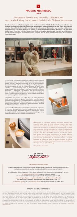 Avec l’ouverture de sa Maison en plein cœur du Marais au 47 rue Vieille du Temple, Nespresso fédère une véritable communauté de talents, d’amis et de personnalités inspirantes autour du café. Après une première création signée The Social Food, le torréfacteur dévoilera dès le 15 décembre une nouvelle collaboration hivernale avec le chef étoilé Mory Sacko, qui met à l’honneur l’alliance du café et des épices. Une rencontre inédite entre l’expertise café de Nespresso et l’univers singulier du chef, qui poursuit sa collaboration avec le torréfacteur pour la quatrième année, toujours avec la même ambition d’innover et de sublimer l’expérience café.