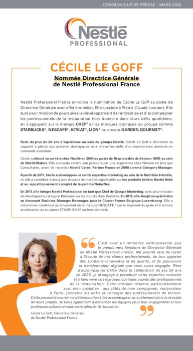 Nestlé Professional France annonce la nomination de Cécile Le Goff au poste de Directrice Générale avec effet immédiat. Elle succède à Pierre-Claude Lambert. Elle aura pour mission de poursuivre le développement de l’entreprise et d’accompagner les professionnels de la restauration hors domicile dans leurs défis quotidiens, en s’appuyant sur la marque Chef et les marques iconiques du groupe comme