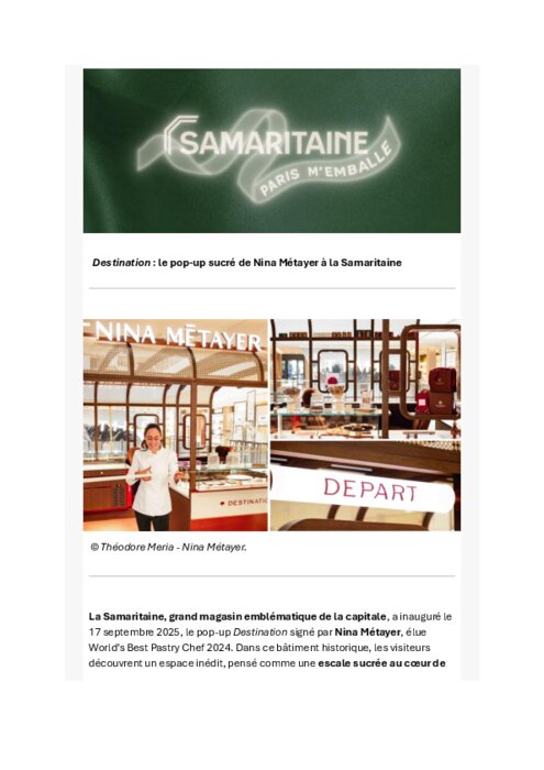 La Samaritaine, grand magasin emblématique de la capitale, a inauguré le 17 septembre, le pop-up Destination signé par Nina Métayer, élue World’s Best Pastry Chef 2024. Dans ce bâtiment historique, les visiteurs découvrent un espace inédit, pensé comme une escale sucrée au cœur de Paris, qui illustre à la fois le savoir-faire d’une cheffe pâtissière reconnue et l’esprit créatif de la Samaritaine.