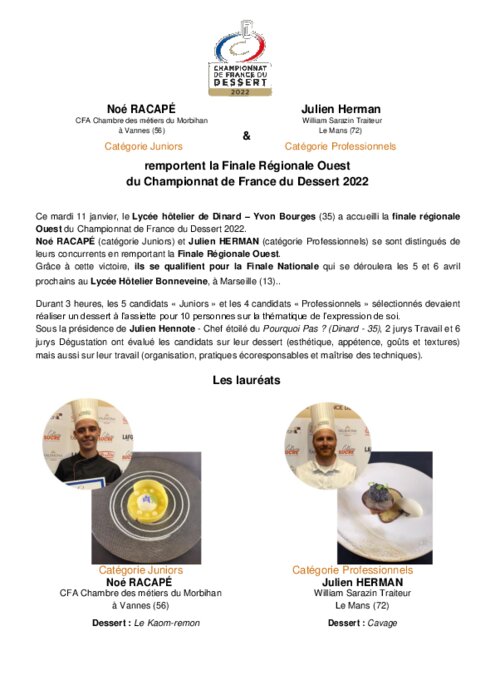 Métiers 11 janvier 2022 - 19:18 Durant 3 heures, les 5 candidats « Juniors » et les 4 candidats « Professionnels » sélectionnés devaient réaliser un dessert à l’assiette pour 10 personnes sur la thématique de l’expression de soi. PDF (324 Ko) Télécharger