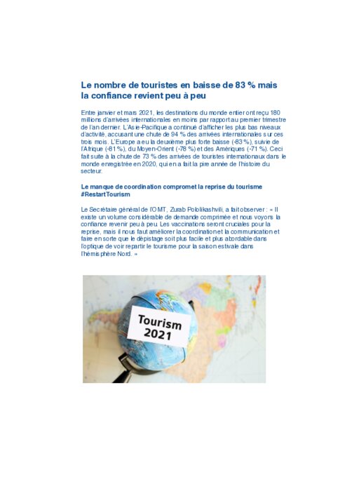Les arrivées de touristes internationaux ont baissé de 83 % au premier trimestre 2021 en raison du maintien de restrictions généralisées sur les voyages. Cependant, l’indice de confiance établi par l’OMT montre des signes d’un léger retour de la confiance.