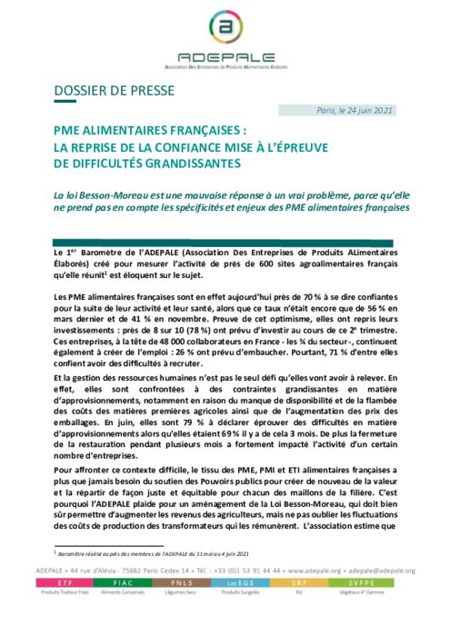 Au moment où débutent les débats en séance publique sur la proposition de Loi BessonMoreau, la confiance en l’avenir des TPE, PME et ETI alimentaires françaises est menacée