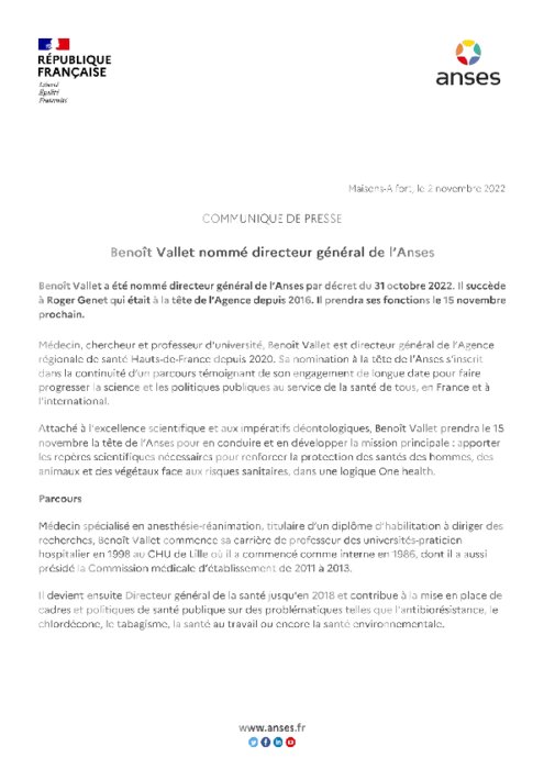 Nomination de Benoît Vallet, directeur général de l'Anses