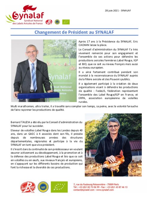 Après 17 ans à la Présidence du SYNALAF, Eric CACHAN laisse la place à Bernard TAUZIA, éleveur de volailles Label Rouge dans les Landes depuis 40 ans élu par le Conseil d'administration du SYNALAF.
