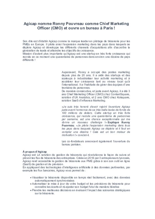 Ronny Pouvreau est nommé comme Chief Marketing Officer d’Agicap. Arrivé début mai 2021, juste avant l’annonce de la levée de fonds de 100 millions de dollars, Ronny manage les équipes globales de marketing et réfère à Mickaël Jordan, Chief Revenue Officer (CRO).