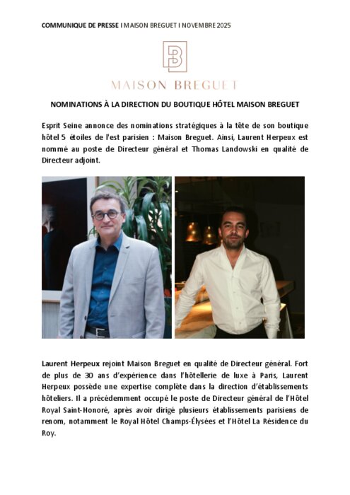 Laurent Herpeux est nommé au poste de Directeur général et Thomas Landowski en qualité de Directeur adjoint chez Maison Bréguet. Laurent Herpeux rejoint Maison Breguet en qualité de Directeur général. Fort de plus de 30 ans d’expérience dans l’hôtellerie de luxe à Paris, Laurent Herpeux possède une expertise complète dans la direction d’établissements hôteliers. Il a précédemment occupé le poste de Directeur général de l’Hôtel Royal Saint Honoré, après avoir dirigé plusieurs établissements parisiens de renom, notamment le Royal Hôtel Champs-Élysées et l’Hôtel La Résidence du Roy.