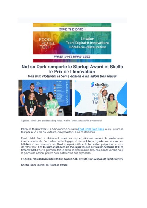 Métiers 13 juin 2022 - 14:27 La 5ème édition du salon Food Hotel Tech Paris, a été un succès tant par le nombre de visiteurs, d’exposants que de conférences. PDF (321 Ko) Télécharger