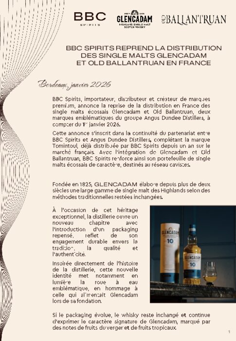 BBC Spirits, importateur, distributeur et créateur de marques premium, annonce la reprise de la distribution en France des single malts écossais Glencadam et Old Ballantruan, deux marques emblématiques du groupe Angus Dundee Distillers, depuis le 1er janvier. Cette annonce s’inscrit dans la continuité du partenariat entre BBC Spirits et Angus Dundee Distillers, complétant la marque Tomintoul, déjà distribuée par BBC Spirits depuis un an sur le marché français. Avec l’intégration de Glencadam et Old Ballantruan, BBC Spirits renforce ainsi son portefeuille de single malts écossais de caractère, destinés au réseau des cavistes.