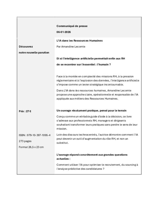 Conçu comme un véritable guide d’aide à la décision, ce livre s’adresse aux professionnels RH, managers et dirigeants souhaitant transformer leurs pratiques sans perdre le sens de leur mission. Loin des discours technocentrés, l’autrice démontre comment l’IA peut devenir un outil d’augmentation du rôle RH, et non un substitut.