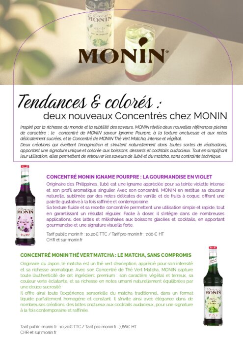 Inspiré par la richesse du monde et la subtilité des saveurs, Monin révèle deux nouvelles références pleines de caractère : le concentré de Monin saveur Igname Pourpre, à la texture onctueuse et aux notes délicatement sucrées, et le Concentré de Monin Thé Vert Matcha, intense et végétal.
