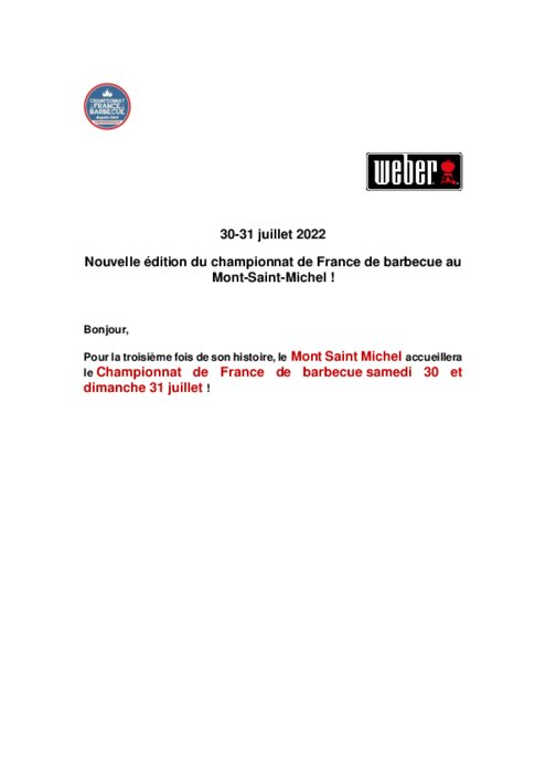 Métiers 13 juillet 2022 - 12:04 Pour la troisième fois de son histoire, le Mont Saint Michel accueillera le Championnat de France de barbecue samedi 30 et dimanche 31 juillet . PDF (603 Ko) Télécharger