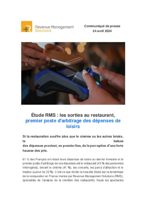 Si la restauration souffre plus que le cinéma ou les autres loisirs, la baisse des dépenses provient, en premier lieu, de la perception d’une forte hausse des prix. 61 % des Français ont réduit leurs dépenses de loisirs au dernier trimestre et le premier poste d’arbitrage de ces dépenses est le restaurant (43 % des personnes interrogées), devant le cinéma (41 %), les concerts, les parcs d’attraction et le théâtre (autour de 20 %). C’est ce que révèle la nouvelle étude sur la dynamique de la restauration en France menée par Revenue Management Solutions (RMS), spécialiste de l’analyse de la clientèle des restaurants.