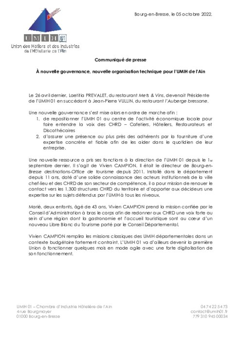 Le 26 avril dernier, Laetitia PREVALET, du restaurant Mets & Vins, devenait Présidente de l’UMIH 01 en succédant à Jean-Pierre VULLIN, du restaurant l’Auberge bressane.