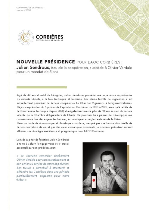 Le Syndicat de l’AOC Corbières annonce la nomination de Julien Sendrous à la présidence de l’appellation, pour un mandat de trois ans. Issu de la coopération et déjà engagé de longue date au sein du syndicat, il succède à Olivier Verdale avec l’ambition de poursuivre un travail de fond autour de la valorisation des terroirs, de l’adaptation aux enjeux climatiques et du renforcement de la visibilité de l’appellation.