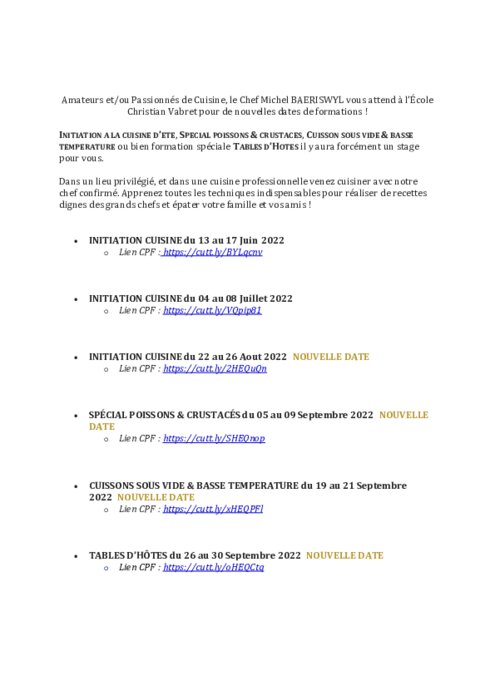 Métiers 30 mai 2022 - 11:50 Amateurs et/ou Passionnés de Cuisine, le Chef Michel BAERISWYL donne rendez-vous à l’École Christian Vabret pour de nouvelles dates de formations . PDF (174 Ko) Télécharger
