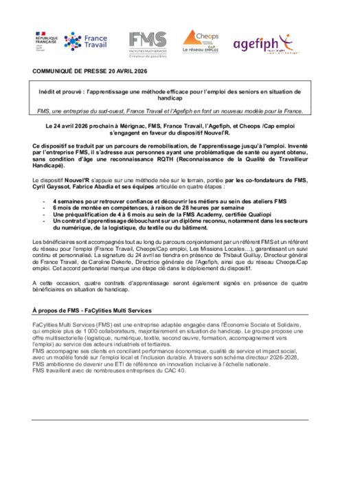Le 24 avril à Mérignac, FMS, France Travail, l’Agefiph, et Cheops /Cap emploi s’engagent en faveur du dispositif Nouvel’R. Ce dispositif se traduit par un parcours de remobilisation, de l'apprentissage jusqu’à l'emploi. Inventé par l’entreprise FMS, il s’adresse aux personnes ayant une problématique de santé ou ayant obtenu, sans condition d’âge une reconnaissance RQTH (Reconnaissance de la Qualité de Travailleur Handicapé).