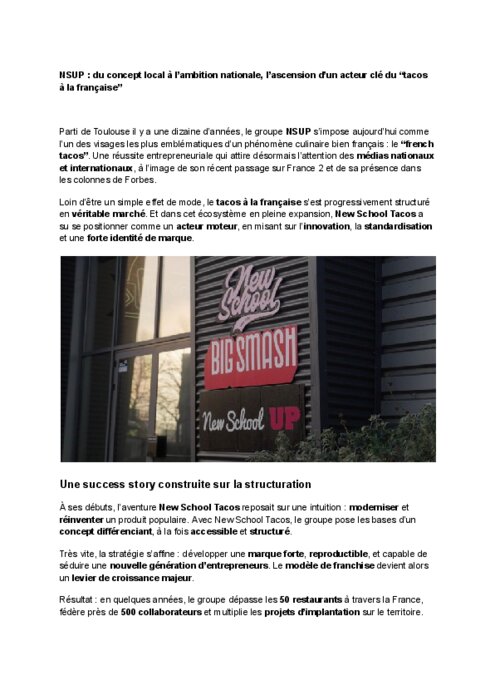Parti de Toulouse il y a une dizaine d’années, le groupe NSUP s’impose aujourd’hui comme l’un des visages les plus emblématiques d’un phénomène culinaire bien français : le “french tacos”. Une réussite entrepreneuriale qui attire désormais l’attention des médias nationaux et internationaux, à l’image de son récent passage sur France 2 et de sa présence dans les colonnes de Forbes.