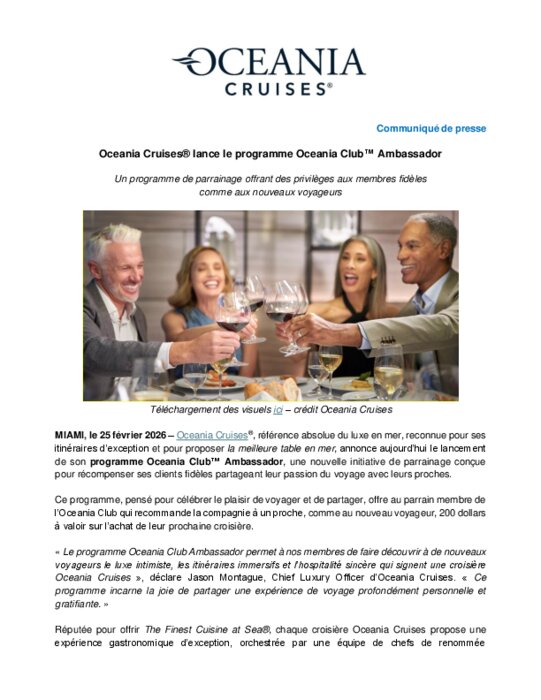 Avec le lancement de son nouveau programme de parrainage Oceania Club Ambassador, la compagnie de croisières de luxe - reconnue pour ses itinéraires d’exception et pour proposer la meilleure table en mer - célèbre l’art de partager ses plus belles expériences en mer.