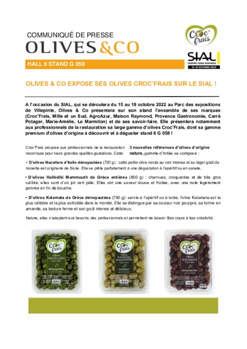 Fournisseurs 13 septembre 2022 - 09:45 Olives & Co présentera sur son stand notamment aux professionnels de la restauration sa large gamme d’olives Croc’Frais, dont sa gamme premium d’olives d’origine à découvrir et à déguster. PDF (206 Ko) Télécharger