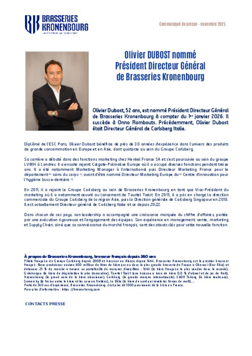 Diplômé de l’ESC Paris, Olivier Dubost bénéficie de près de 30 années d'expérience dans l'univers des produits de grande consommation en Europe et en Asie, dont quatorze au sein du Groupe Carlsberg. Sa carrière a débuté dans des fonctions marketing chez Henkel France SA et s’est poursuivie au sein du groupe LVMH à Londres. Il a ensuite rejoint Colgate-Palmolive Europe où il a occupé diverses fonctions pendant treize ans. Il a été notamment Marketing Manager à l'international puis Directeur Marketing France pour le département « soins du corps », avant d'être nommé Directeur Marketing Europe du « Centre d'innovation pour l'hygiène bucco-dentaire ».