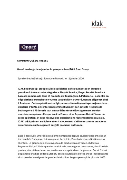 Idak Food Group, groupe suisse spécialisé dans l’alimentation surgelée premium à travers trois catégories – Pizza & Snacks, Finger Food & Snacks à base de pommes de terre et Produits de Boulangerie & Pâtisserie – est entré en négociations exclusives en vue de l’acquisition d’Onoré, dont le siège est situé à Toulouse. Cette opération stratégique constituerait une étape majeure dans l’histoire d'Idak , en renforçant significativement son activité Produits de Boulangerie & Pâtisserie tout en accélérant son développement sur des marchés européens clés que sont la France et le Royaume-Uni. À l’issue de cette opération, et sous réserve des autorisations réglementaires usuelles, Idak , déjà présent en Suisse et en Italie, entend s’affirmer comme un acteur de référence sur le segment surgelé premium en Europe.