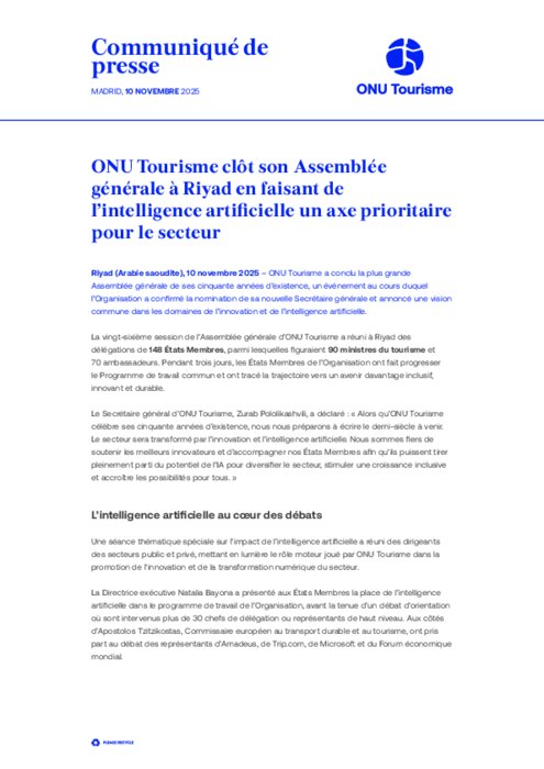 La vingt-sixième session de l’Assemblée générale d’ONU Tourisme a réuni à Riyad des délégations de 148 États Membres, parmi lesquelles figuraient 90 ministres du tourisme et 70 ambassadeurs. Pendant trois jours, les États Membres de l’Organisation ont fait progresser le Programme de travail commun et ont tracé la trajectoire vers un avenir davantage inclusif, innovant et durable.