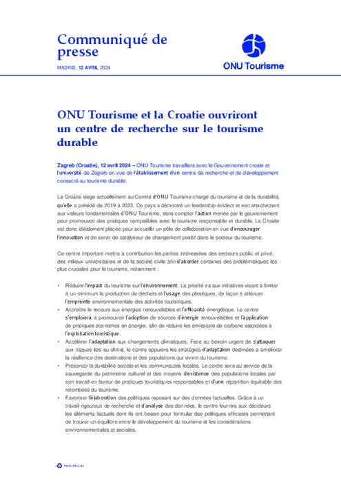 ONU Tourisme travaillera avec le Gouvernement croate et l’université de Zagreb en vue de l’établissement d’un centre de recherche et de développement consacré au tourisme durable. La Croatie siège actuellement au Comité d’ONU Tourisme chargé du tourisme et de la durabilité, qu’elle a présidé de 2019 à 2023. Ce pays a démontré un leadership évident et son attachement aux valeurs fondamentales d’ONU Tourisme, sans compter l’action menée par le gouvernement pour promouvoir des pratiques compatibles avec le tourisme responsable et durable.
