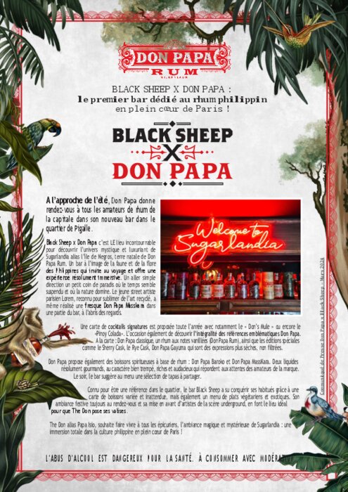 A l’approche de l’été, Don Papa donne rendez-vous à tous les amateurs de rhum de la capitale dans son nouveau bar dans le quartier de Pigalle. Un bar à l’image de la faune et de la flore des Philippines qui invite au voyage et offre une expérience résolument immersive. Un aller simple direction un petit coin de paradis où le temps semble suspendu et où la nature domine. Le jeune street artiste parisien Lorem, reconnu pour sublimer de l’art recyclé, a même réalisé une fresque Don Papa Masskara dans une partie du bar, à l’abris des regards.