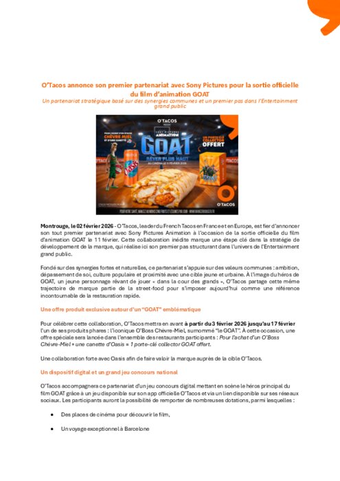 O’Tacos, leader du French Tacos en France et en Europe, est fier d’annoncer son tout premier partenariat avec Sony Pictures Animation à l’occasion de la sortie officielle du film d’animation GOAT le 11 février. Cette collaboration inédite marque une étape clé dans la stratégie de développement de la marque, qui réalise ici son premier pas structurant dans l’univers de l’Entertainment grand public.