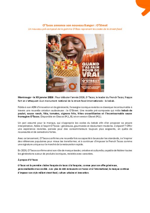 Fidèle à son ADN d’innovation et de générosité, l’enseigne iconique revisite ce classique incontournable à travers une nouvelle création audacieuse : le O’Street. Une recette pré-composée qui mêle kebab de poulet, sauce ranch, fêta, tomates, oignons frits, frites croustillantes et l’incontournable sauce fromagère O’Tacos. Disponible en Otacos (M,L,XL) et en version Obowl (M,L).