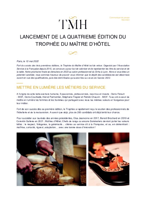 Fort du succès des trois premières éditions, le Trophée du Maître d’Hôtel est de retour. Organisé par l’Association Service à la Française depuis 2015, ce concours a pour but de valoriser et de représenter les Arts du service et de la table.