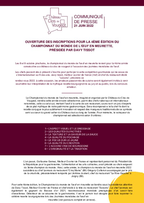 Métiers 21 juin 2022 - 12:34 Les 8 et 9 octobre prochains, le championnat du monde de l'œuf en meurette revient pour la 4ème année consécutive au château du clos de vougeot à l’occasion des journées mondiales de l’œuf. PDF (251 Ko) Télécharger